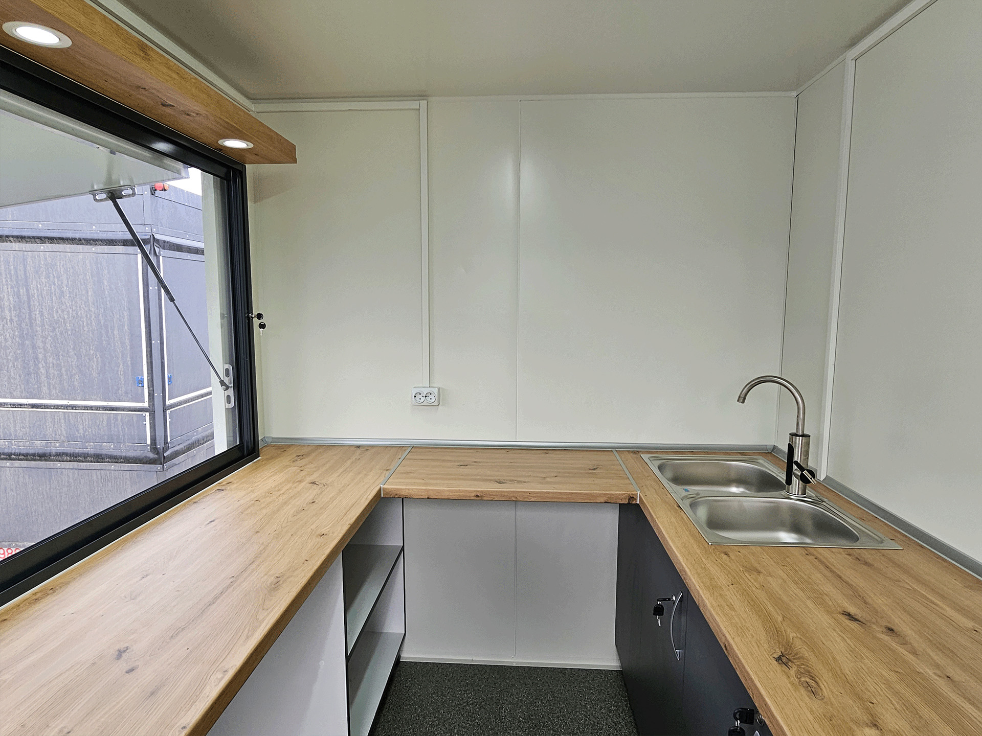 Elektromos hálózat: Egyfázisú 220V rendszer villanyórával, biztosítéktáblával és 4 db dupla aljzattal. A munkaterületet elegáns belső szpotlámpák világítják meg.