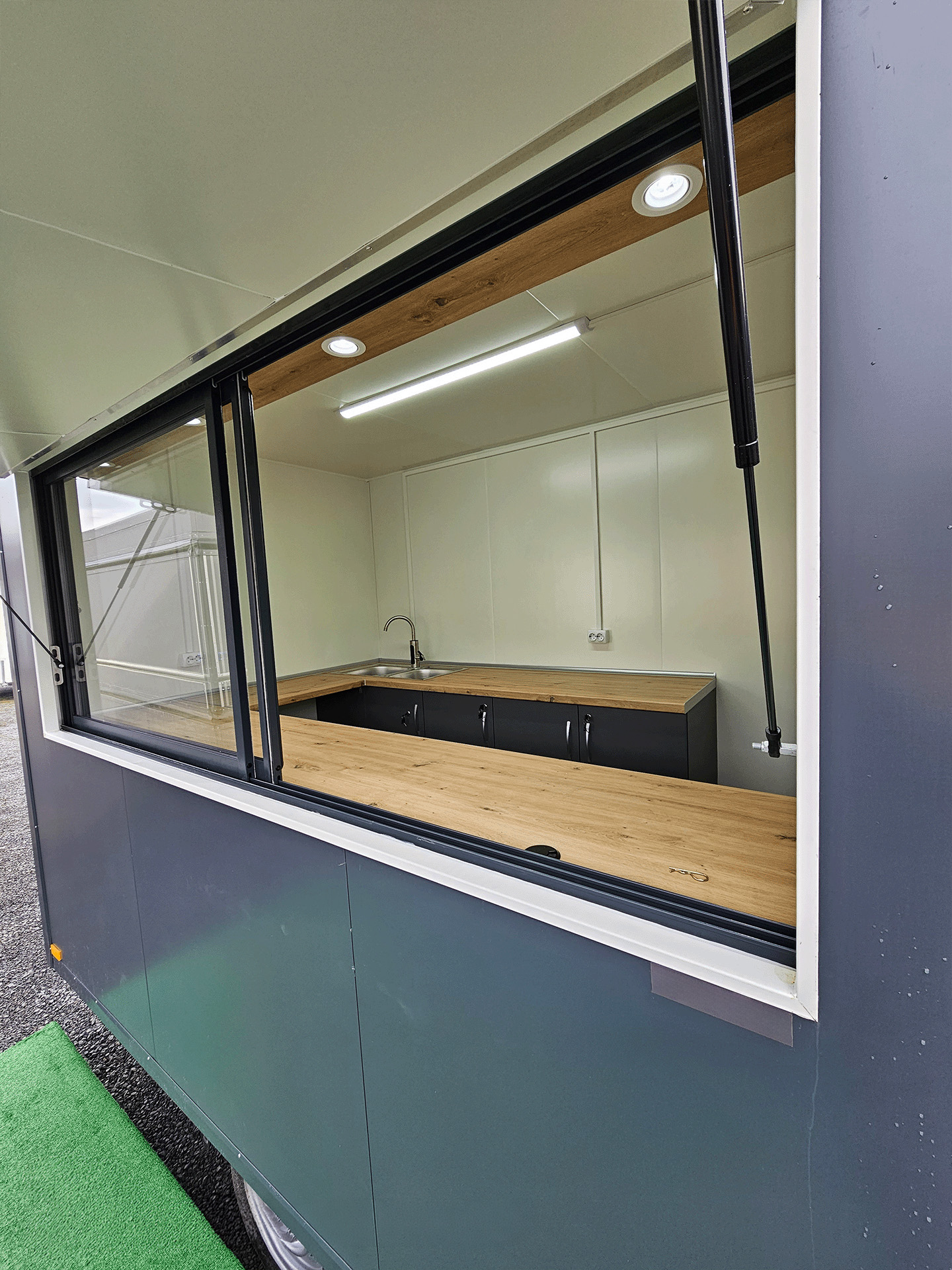 Kombinált ablakrendszer: A kocsi egy felfelé nyíló esővédő ablakkal és egy belső, alumínium profilú csúsztatható ablakkal is rendelkezik. Ez lehetővé teszi a hőszabályozást és a higiénikusabb kiszolgálást a forgalmasabb időszakokban is.