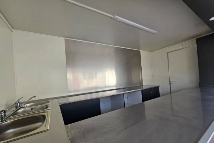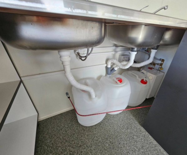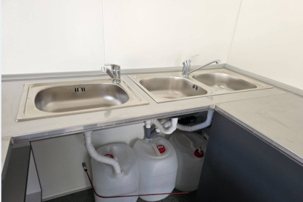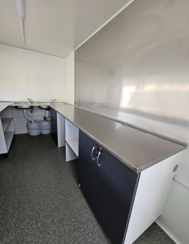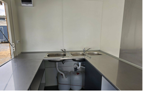 • Vízszerelés: dupla rozsdamentes kagyló, 1 es rozsdamentes kézmosó, 30 L-es víztartály, instant vízmelegítős csap