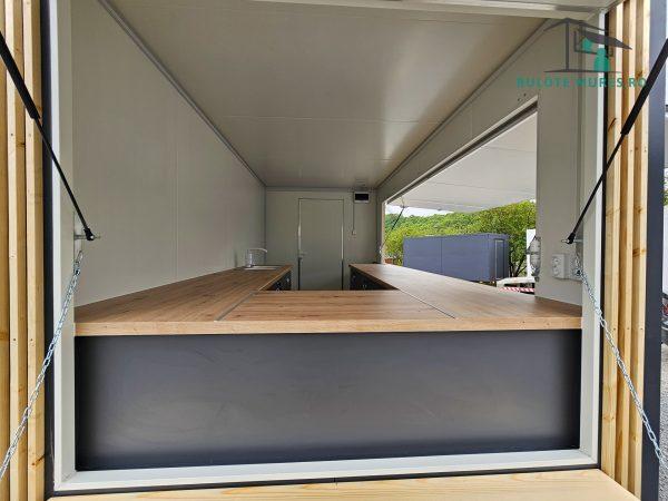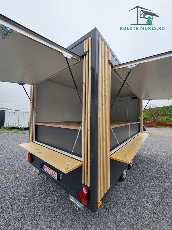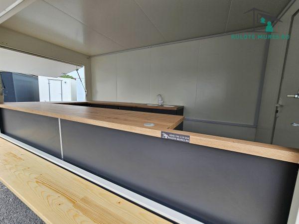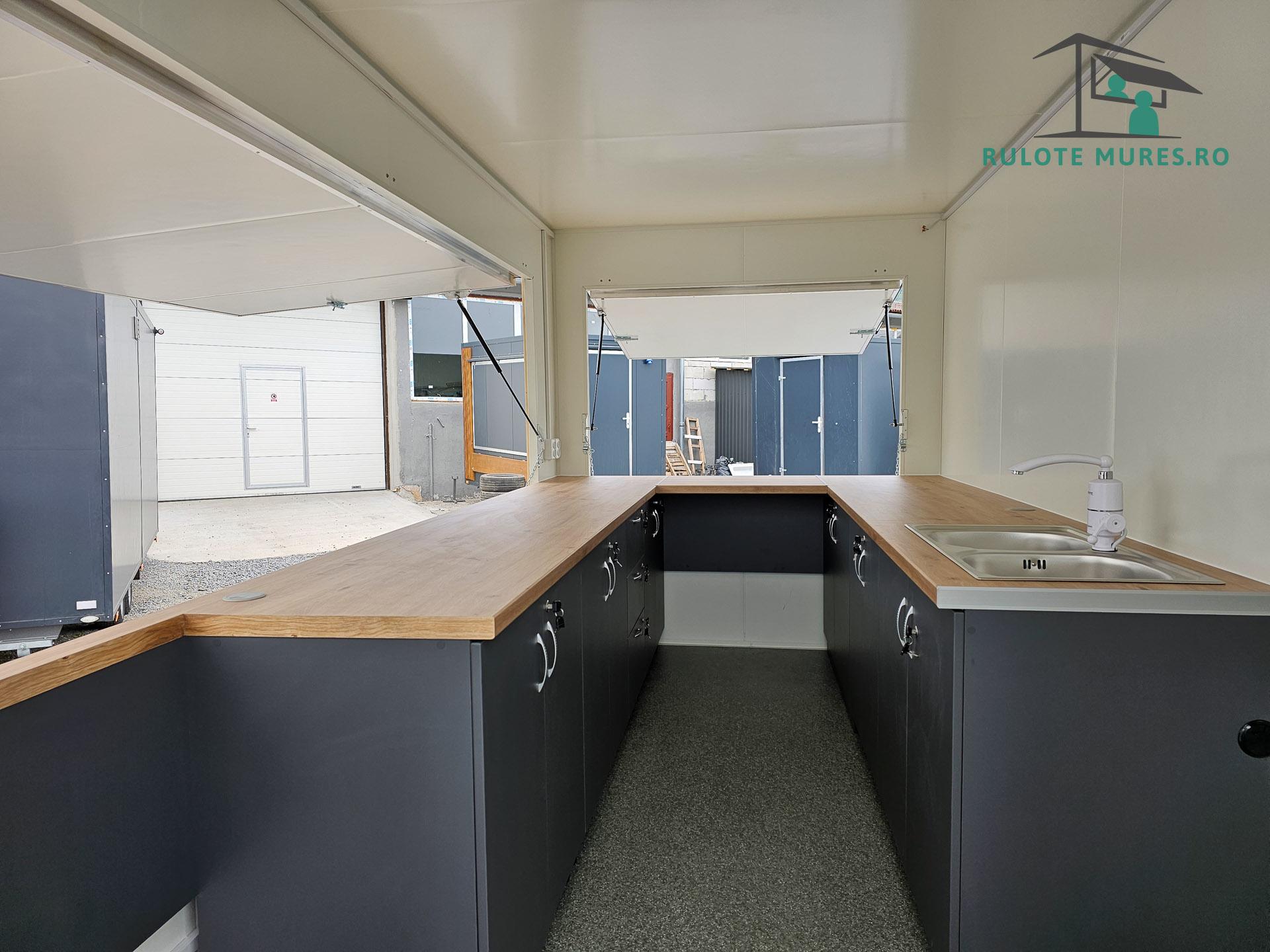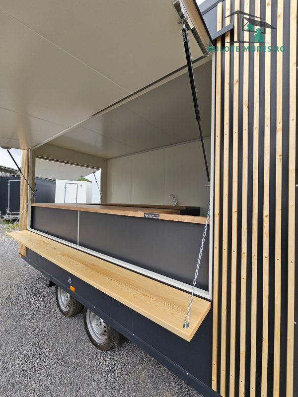 - A büfékocsi két kiszolgáló ablakkal rendelkezik, amelyek felfele nyílnak és az ablak alatt 50 cm magas fal marad a padlótól.