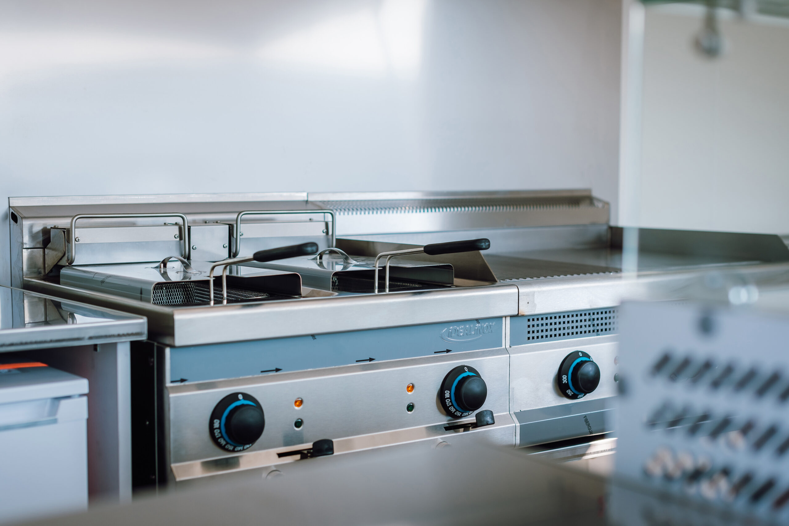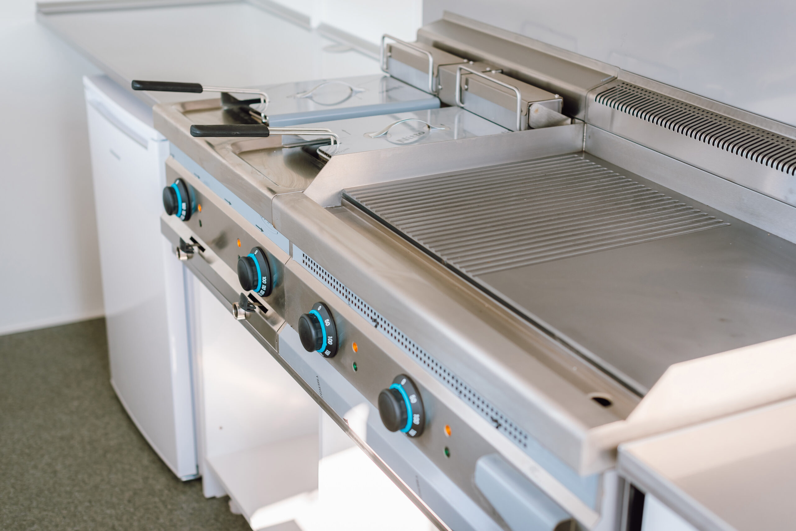 Sütőállomás: A beépített gázos rostlap és a dupla elektromos olajsütő ideális hamburgerek, húsok és köretek párhuzamos készítéséhez.